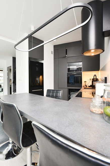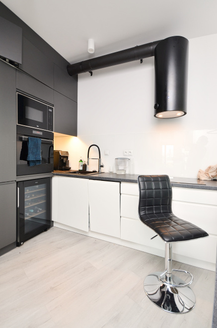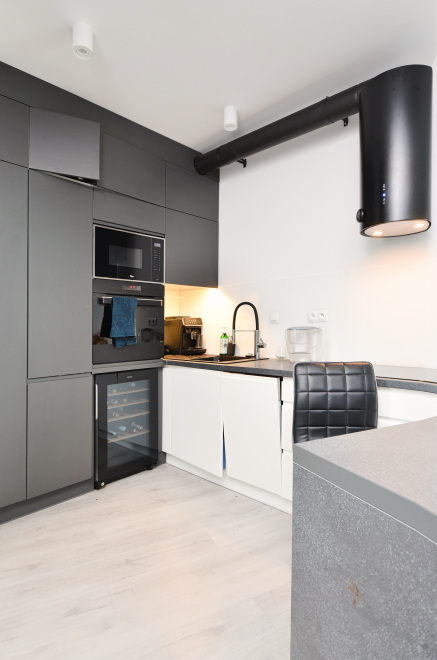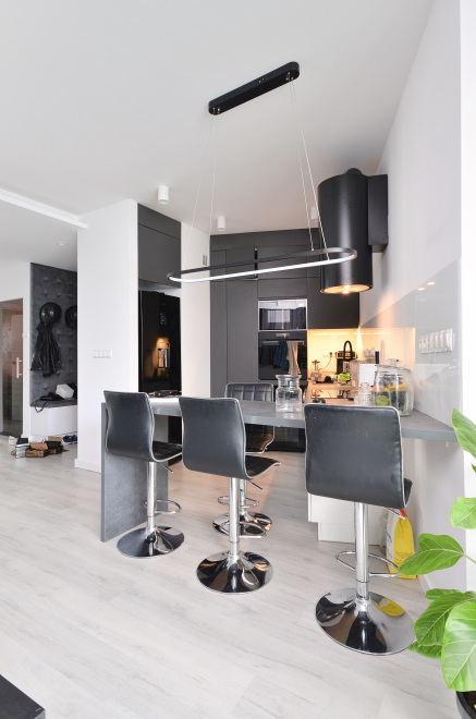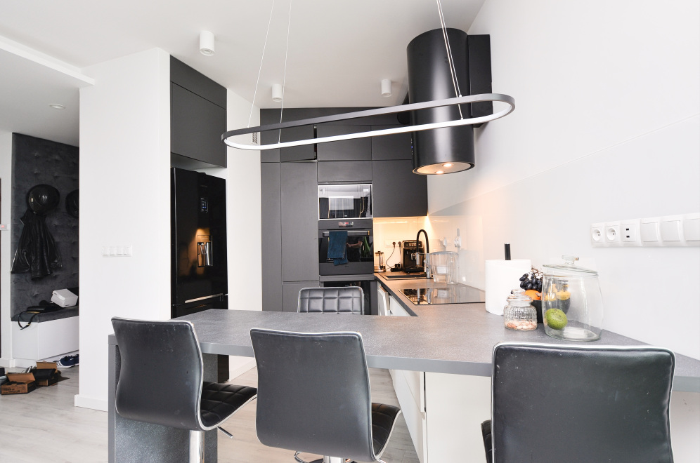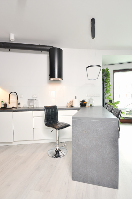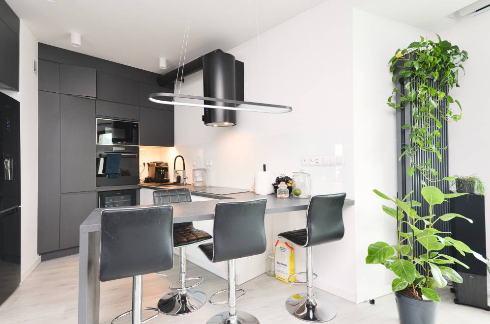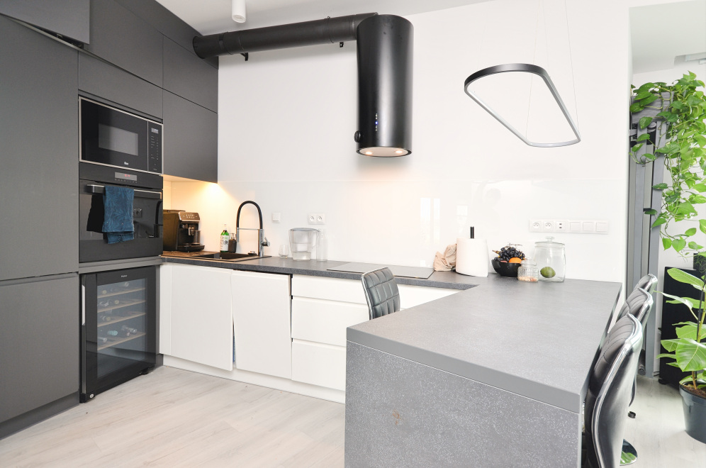 Meble kuchenne zrealizowane w Warszawie. Realizacja trudna do aranżacji, mieszkanie posiadające skośne ściany. Skośne blaty z funkcja stolika. Meble wykonane w technologii lakier mat. W słupkach poniżej piekarnika zamontowano lodówke dedykowana na wina. Surowe białe i grafitowe fronty, połączone z zielenią przepięknych kwiatów zachęcają do długiego wypoczynku w salonie połączonym z częścią kuchenną. Idealnie dobrane oświetlenie mebli kuchennych, daje na poczucie komfortu i miłej egzystencji przy sporządzaniu posiłków. Jeżeli Twoje mieszkanie, posiada trudną przestrzeń do zaprojektowania, zapraszam do nas. Nasi projektanci z kilkudziesięcioletnim doświadczeniem z pewnością znajda sposób i doradzą Ci jak optymalnie wykorzystać przestrzeń kuchni. Zapraszamy