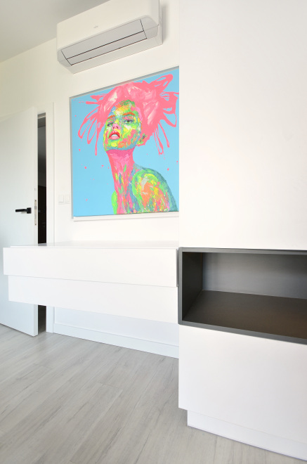 Meble do sypialni i łóżko. Projekt mebli sypialnianych zrealizowany w Warszawie na Pradze. Szafy ubraniowe w sypialni z indywidualną organizacją wnętrza szaf. Łóżko z podnoszonym stelażem. Fronty szafek z melaminy i połączonym zestawem kolorów. Panel wezgłowia łózka podświetlany listwami Led. Piękne dodatki dodają kropkę na „i” całej sypialni.