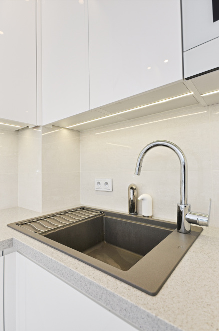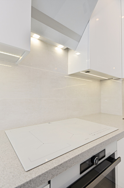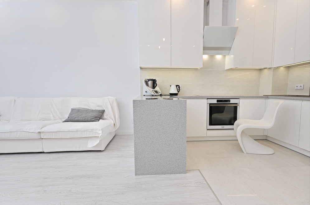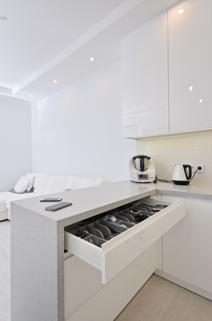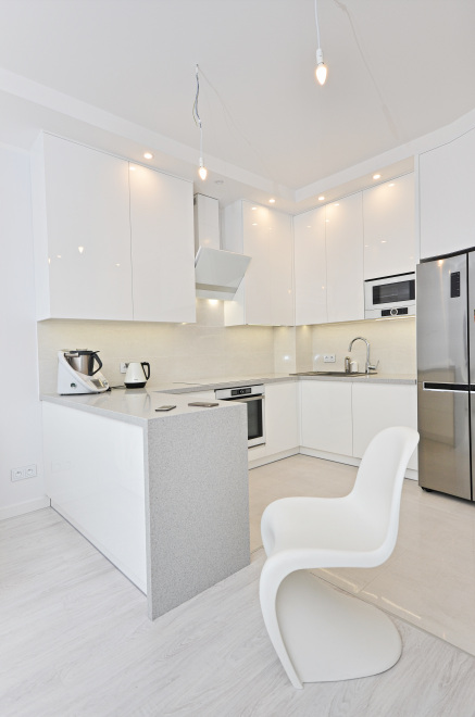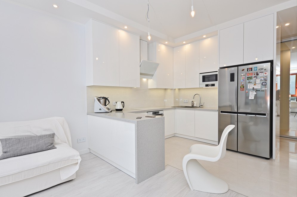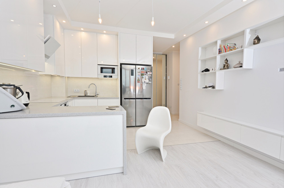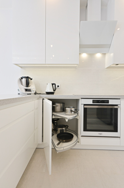 Kuchnia Pani Małgosi z gładkimi lakierami w wysokim połysku, w której to główną rolę grają białe fronty nadające każdemu wnętrzu ponadczasowy szyk i elegancję. Ważną rolę we froncie pełni podfryzowaną linia, dzięki której kuchnia zyskuje nietuzinkowy wygląd. Ponadczasowa biel wspaniale współgra z klasycznym konglomeratem blatu w kolorze nakrapianej szarości, a niezwykle gustownie dobrane AGD-oczywiście w większości w kolorze bieli oraz stali nierdzewnej dodaje tylko szyku tej jakże eleganckiej, a jednocześnie przyjaznej przestrzeni kuchni przechodzącej w niezwykle subtelny i wręcz miękki sposób w przestrzeń niebiańsko białego salonu.