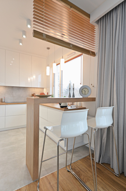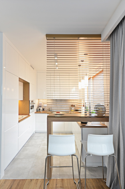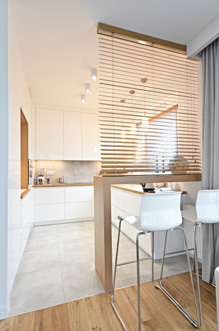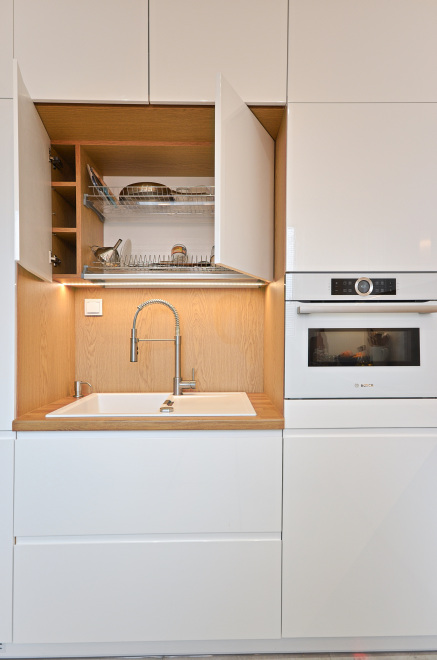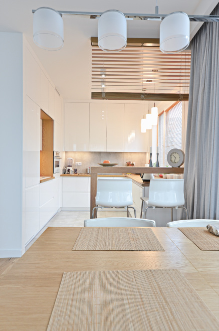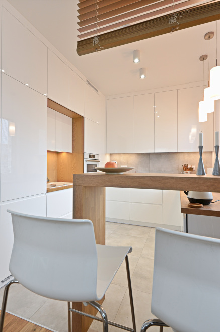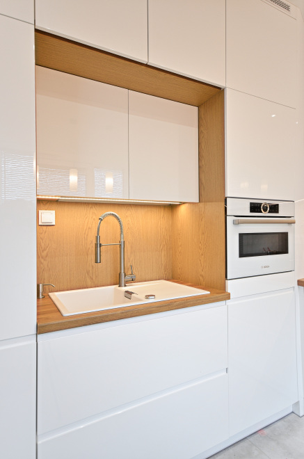 Umeblowana kuchnia z mieszanką dekorów i kolorów. Mieszanka ta daje nam poczucie wzajemnego uzupełniania się. Daje nam poczucie harmonii między czystością i ciepłym odbiorem powierzchni meblowych. Zrównoważony dobór bieli frontów z ciepłymi elementami drewna daje nam spokój przestrzeni. Możemy więc z radością przygotowywać potrawy. Meble rozplanowane są, tak aby ergonomia pracy była zoptymalizowana dla indywidualnych potrzeb naszego klienta.
